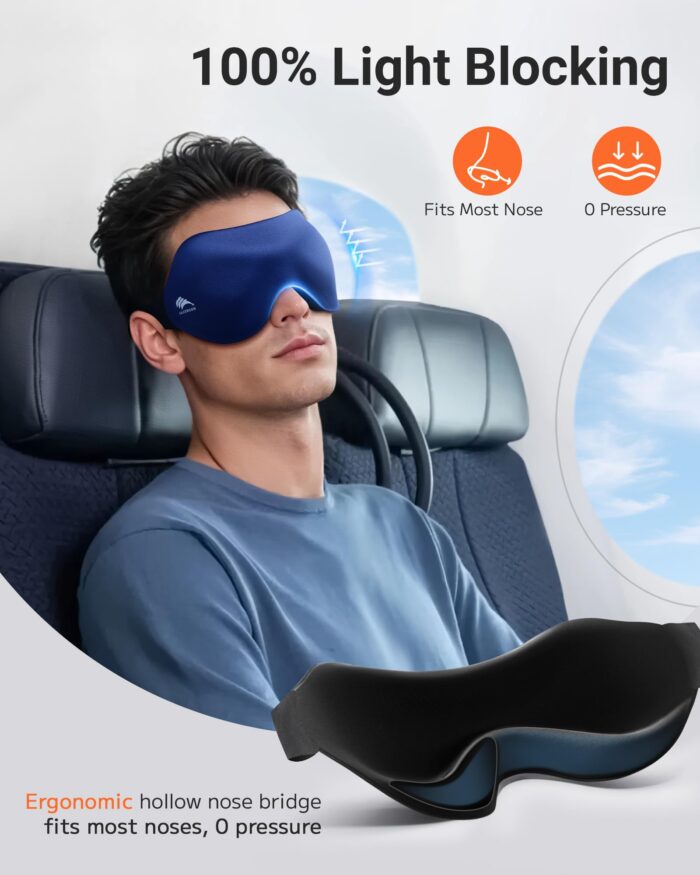 This sleep mask features a hollow nose bridge design and 3D ergonomic contour that fits all nose shapes and facial contours to block out all light. Its ultra-thin, soft-edge design prevents pressure on the temples, staying secure without slipping or letting in light even when you toss and turn while side sleeping. The 30mm-deep 3D structure provides ample room for the eyes and lashes, delivering true zero eye pressure while preventing lash bending and keeping makeup intact. Made of breathable, skin-friendly fabric with high-quality low-resilience memory foam, it weighs only 0.6 ounces—gentle on sensitive skin and free from facial pressure. It also comes with an adjustable, hair-friendly soft headband that fits various head sizes and works for both men and women. Additionally, the mask includes earplugs and a storage pouch, trusted by over 1.3 million travelers. Whether you’re in a dorm, nurse’s station, office, on a road trip, or during a flight, it helps you enjoy deep, comfortable sleep.