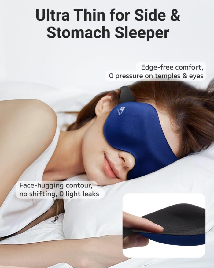 • 𝗖𝗢𝗠𝗙𝗢𝗥𝗧𝗔𝗕𝗟𝗘 𝗙𝗢𝗥 𝗦𝗜𝗗𝗘 𝗦𝗟𝗘𝗘𝗣𝗘𝗥𝗦:Our sleep mask features an ultra-thin, soft edge design that prevents pressure on the temples. Combined with ergonomic 3D contour design, the eye mask perfectly conforms to the face, staying securely in place even when you toss and turn, without slipping or letting in light. Sleep soundly even when side sleeping!