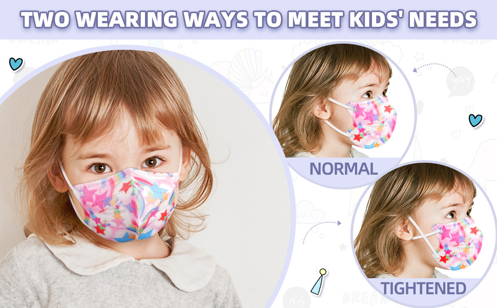• COMFORTABLE & BREATHABLE – The 5MM widened ear loops are more comfortable to wear, the adjustable nose bridge strips tightly fit the nose, making the kn95 kids face mask not easy to fall off
