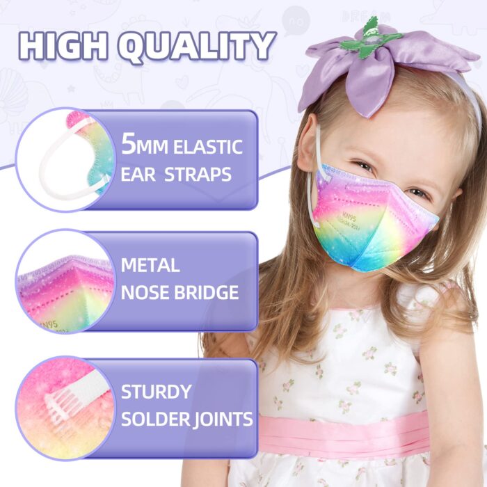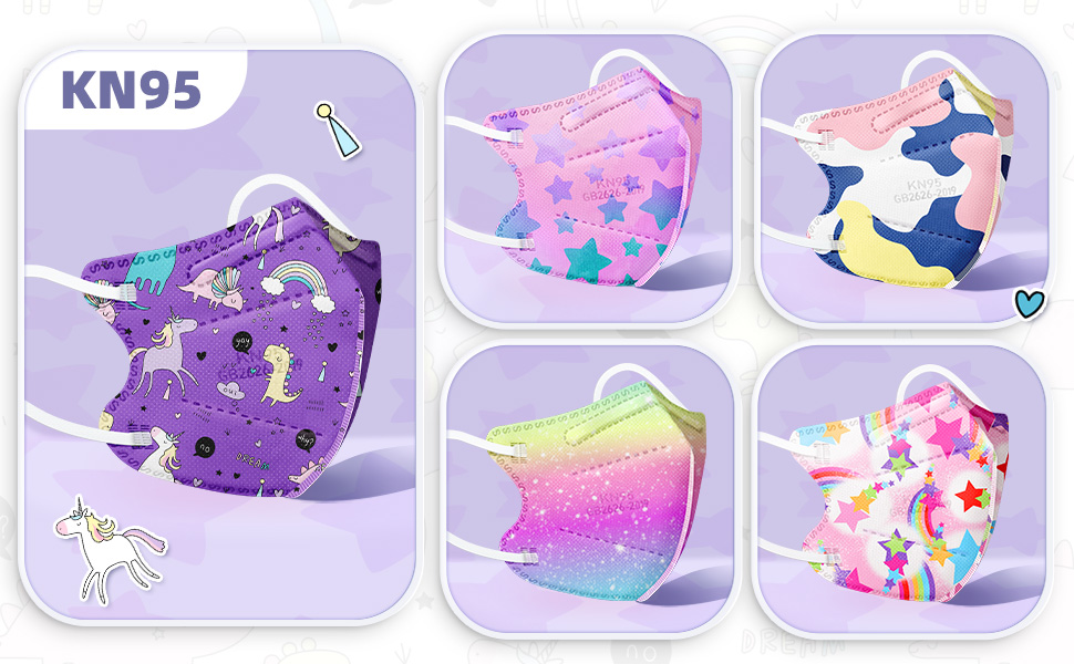 • MULTICOLOR PATTERNS – 50 pcs kids masks disposable kn95 per box, unicorn, dinosaur, stars, rainbow, camo, different colors and patterns to meet your daughter’s daily needs, great for children 4-12 years old for school, kindergarten