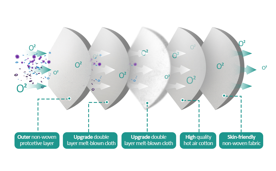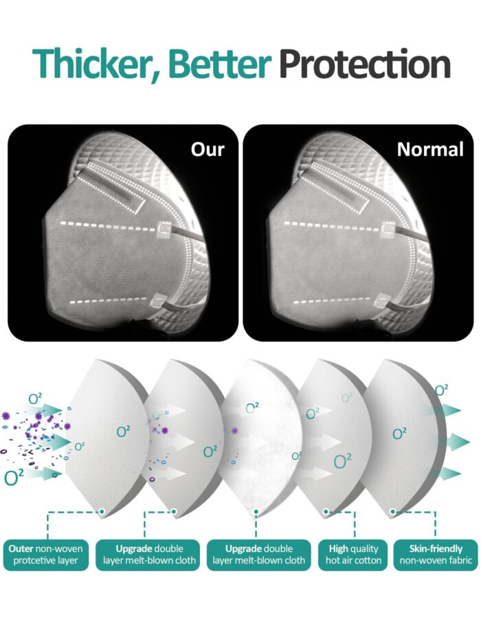 • 5-Layer Protective KN95 Mask: Disposable face masks are made of 2 layers of non-woven fabric, 2 layers of melt-blown fabric, and 1 layer of hot air cotton. Premium material skin friendly, non-irritating, high filter efficiency over 95%, fit GB2626-2019 standard