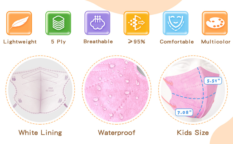 • EARLOOPS NOT EASY TO BREAK: The 5MM widened ear loops are more comfortable to wear, precision welding allows the earbloops to hold nearly 3kg of weight without breaking. The adjustable nose bridge strips tightly fit the nose, making the kn95 kids face mask not easy to fall off