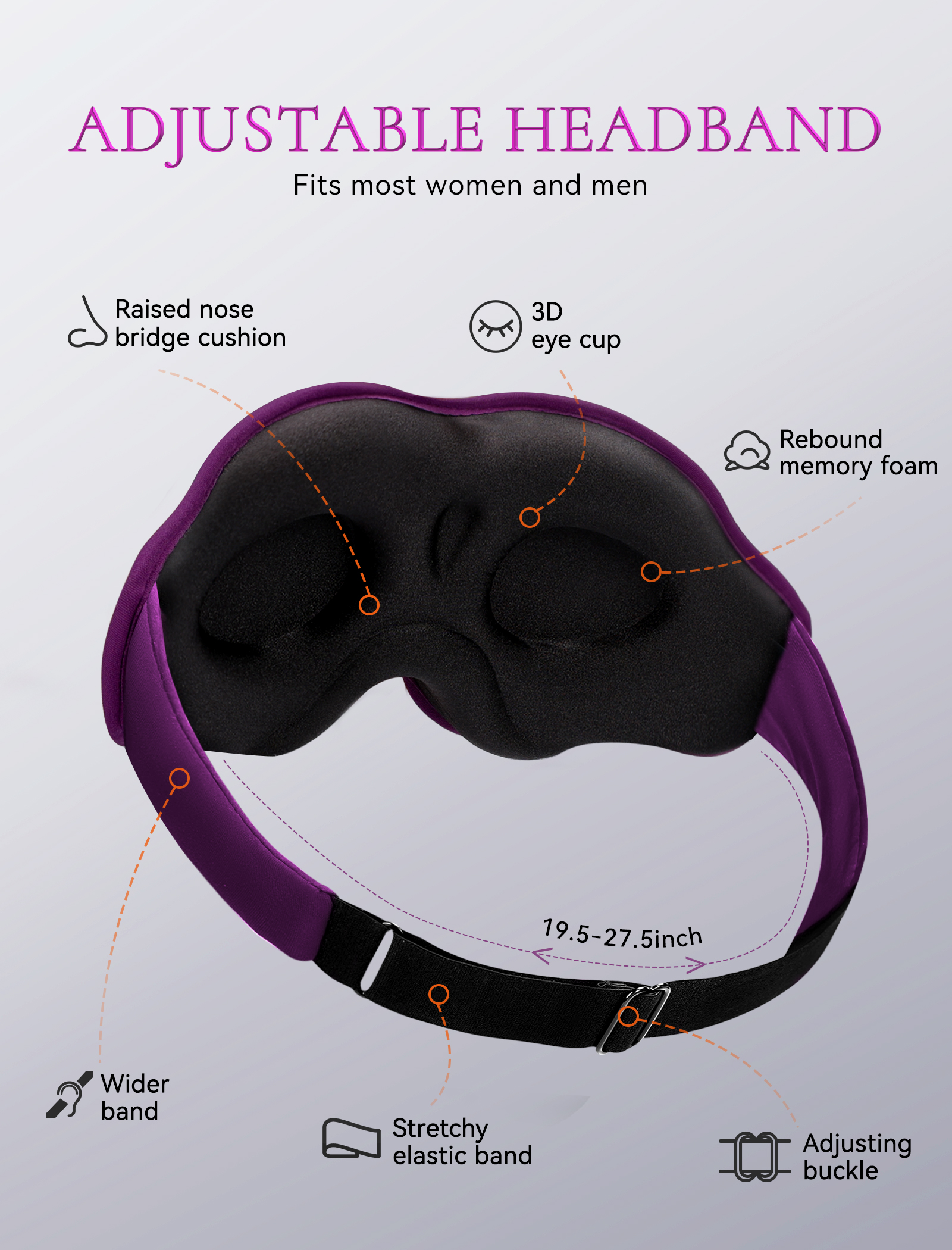 - 【Adjustable Strap adapt to more Head Shape】Sleep mask strap adjusted freely, suitable for head circumference from 20-27inch, soft elastic design won’t pinch your hair, and the soft material is also very friendly to your ears, painless and stress-free for long term wear.